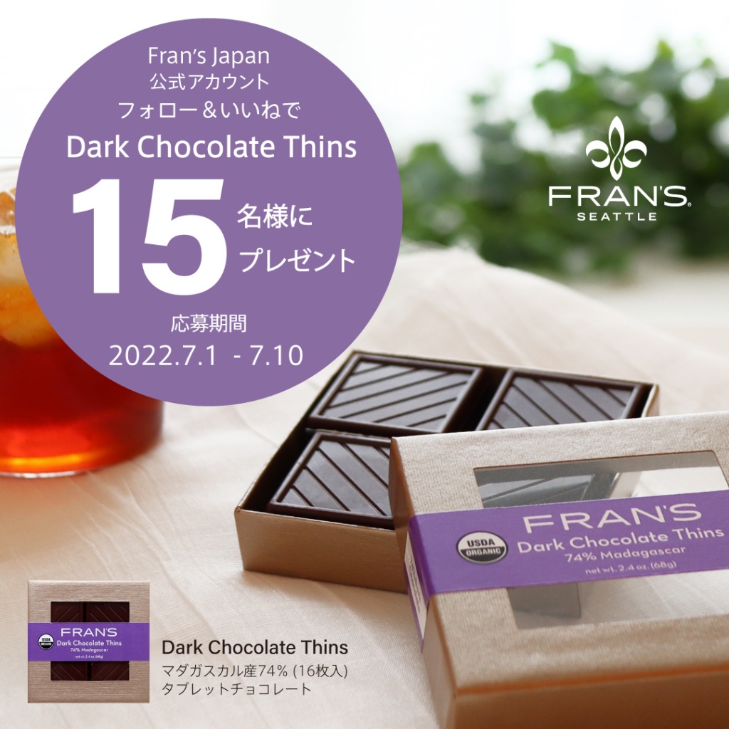 7月1日(金)よりFRAN’S CHOCOLATES公式Instagramアカウント(@frans_japan)にて、『Dark Chocolate Thins PRESENT (ダークチョコレート シン プレゼント)”フォロー&いいね”キャンペーン』を開催します。