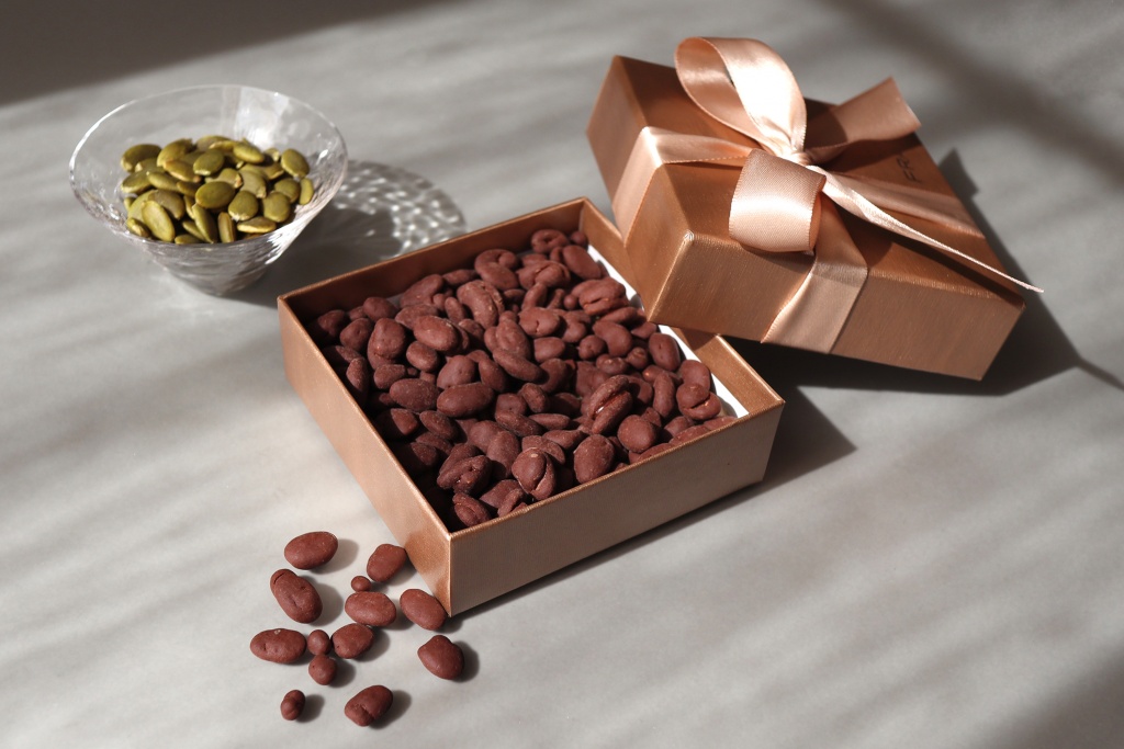 香ばしいカボチャの種をキャラメリゼした後に、芳醇なダークチョコレートをコーティングした珍しいチョコレートです。