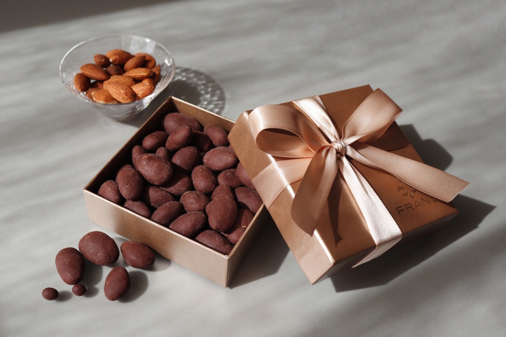厳選された香ばしいアーモンドをキャラメリゼした後に、芳醇なダークチョコレートをコーティングしたチョコレート。